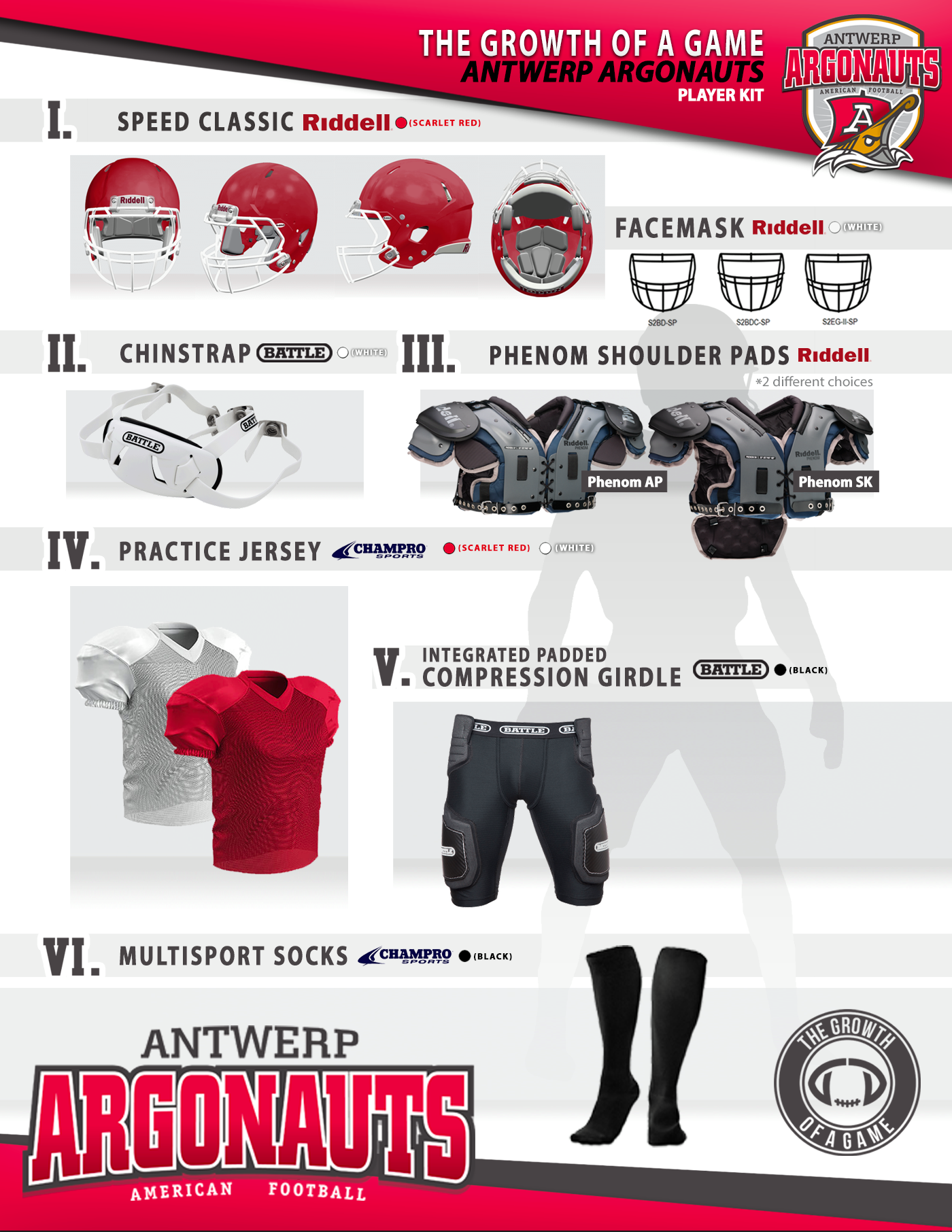 The Antwerp Argonauts Player Kit is a customized player kit that includes all of the essential items that you need to play American football. The kit includes a Riddell Speed Classic Helmet, Battle Chin Strap, Riddell Phenom Shoulder Pads, Champro Practice Jersey, Champro Multisport Socks, and Battle Integrated Padded Compression Girdle. All of these items will give you the tools that you need to succeed.