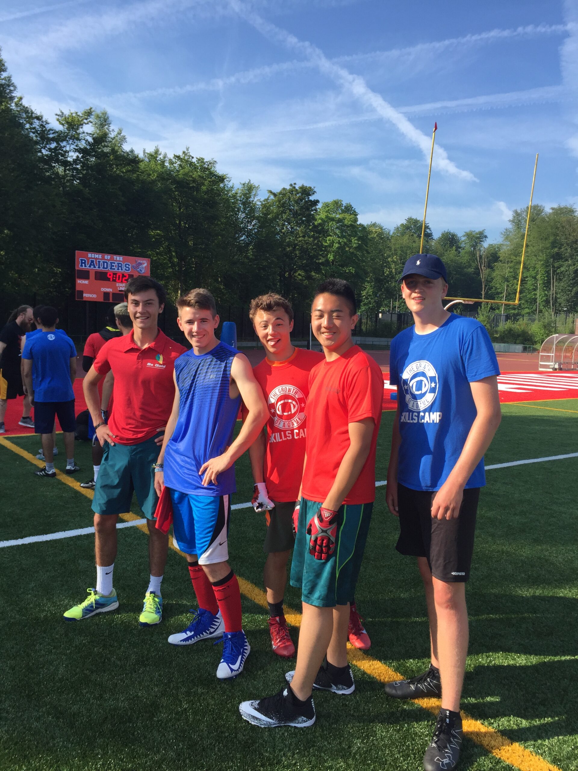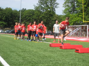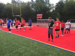 Camp t-shirts will be included in the sign-up cost for players and will be provided during registration. Players will wear t-shirts, shorts, and football cleats – no shoulder pads or helmets.